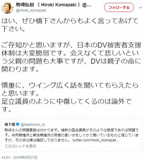 (出典:https://twitter.com/hiroki_komazaki/status/1144123506428301312)今は口だけ評論家になったから僕が維新に何か言える立場じゃないけど、共同親権派の説明が上手くないのは確か。面会保障に共同親権はあまり意味がないのは駒崎さんの言う通り。ただ