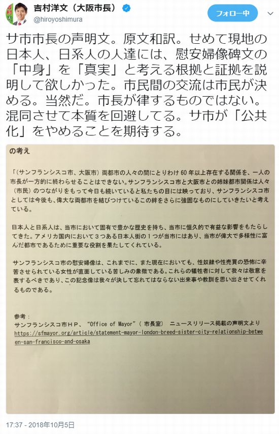 (出典:大阪市との姉妹都市解消「残念」 米サンフランシスコ市長 – 産経WEST)
