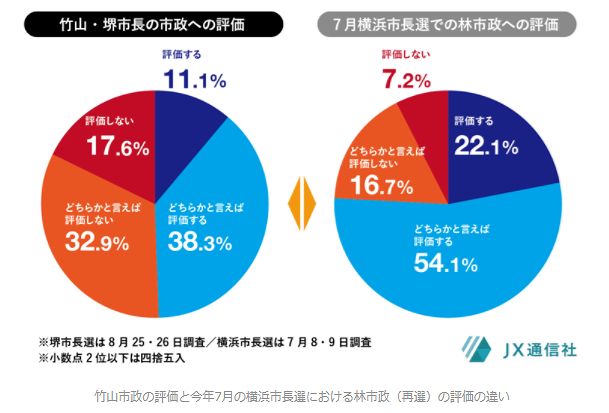 他地域で今回と同様現職が再選を目指す首長選挙において、JX通信社の調査では現職の市政への肯定的評価が6~7割台ほどあることが多い。そして、こうした数字の場合、多くは現職が一定の差をつけて再選される。同じ政令指定都市の首長選では、今年7月に行われた横浜市長選挙もそうだった。他社の調査でも類似の傾向は多く、こうしたケースに比べて竹山氏の8年間の堺市政への評価は相対的に低い。